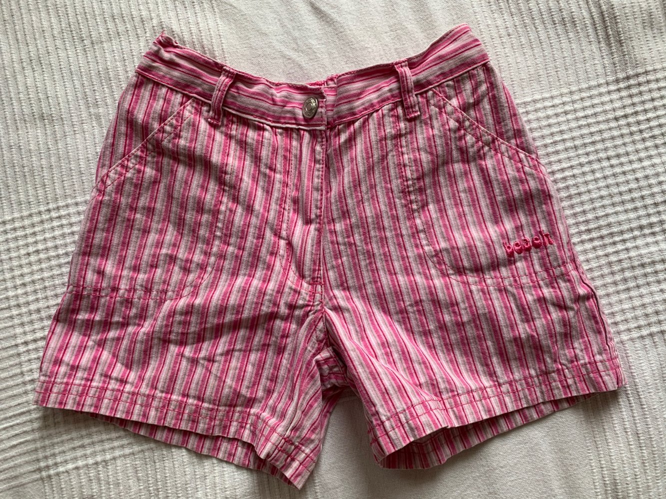 Sehr hübsche Sommershorts. Gestreift in Rot/Rosatönen, Weiß und Grün. Die Shorts besitzt zwei Taschen vorne und auch zwei Gesäßtaschen. Eine Tasche vorne ist mit einer Stickerei „beach“ verziert. Außerdem ist die Shorts mit Gürtelschlaufen sowie einem Gummizug ausgestattet. Der Zustand ist Top (Abb.: ungebügelt). Material: 100% Baumwolle. Nichtraucherhaushalt. Hinweis: Privatverkauf. Keine Rücknahme, Garantie oder Haftung für verloren gegangene Ware, welche unversichert versandt wurde. Verkauf erfolgt ohne jedwede Gewährleistung.