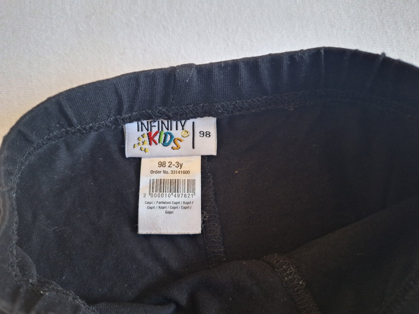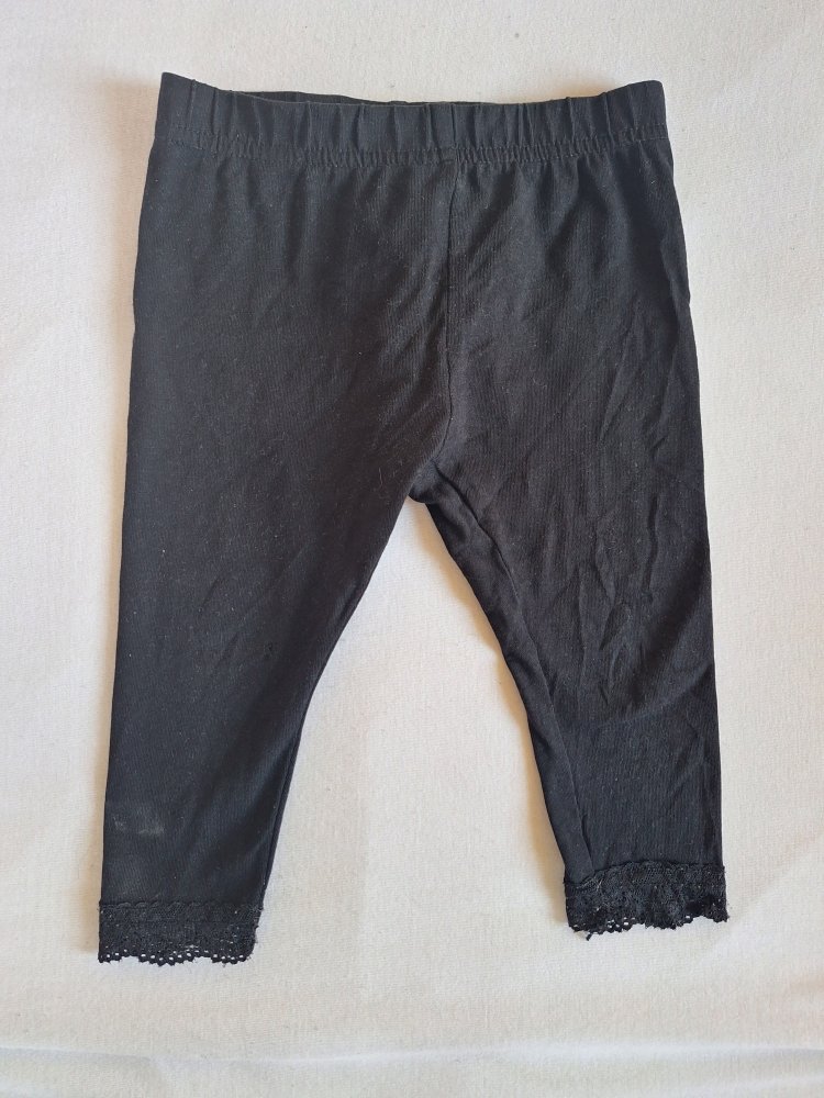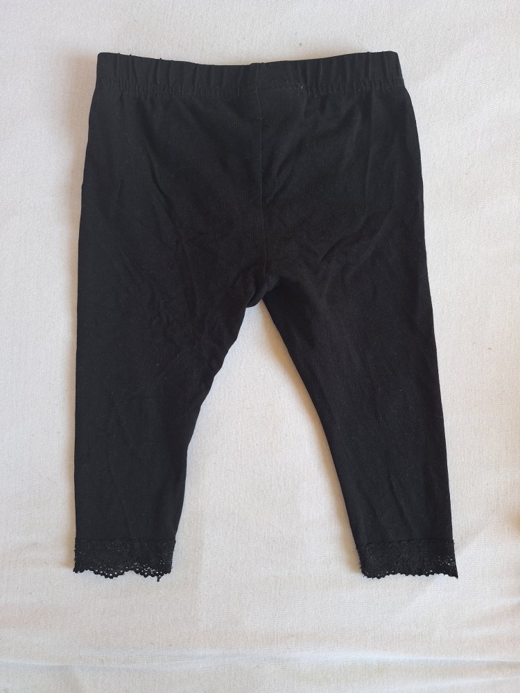Bequeme schwarze Leggings mit Spitze unten, Gr. 98. Toll kombinierbar zu Röcken und Kleidern. Leider ist vorne auf dem einen Bein ein heller Waschmittelfleck.