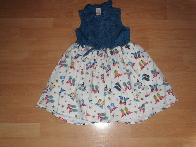 Biete hier ein ärmelloses Kleid von Gillian´s Closet in Größe 128 an. Es besteht aus 100% Baumwolle. Das Oberteil besteht aus einem dünnen Jeansstoff, vorn mit kurzer Knopfleiste und kleiner Brusttasche. Außerdem hat das Oberteil einen Hemdkragen und in der Taille ein kleines Bindebändchen. Das weiße Rockteil ist mit vielen bunten Motiven versehen und fällt schön locker und luftig. Das Kleid wurde nur sehr selten getragen und ist sehr gut erhalten.