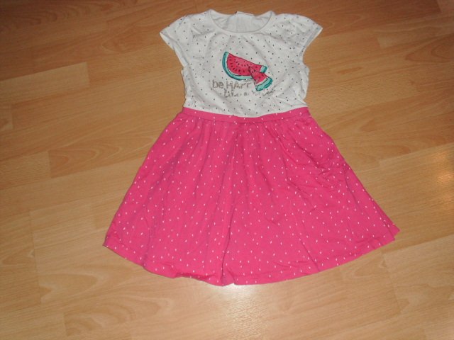 Biete hier ein kurzärmliges Kleid von Topolino in Größe 128 an. Es besteht aus 100% Baumwolle. Das Oberteil ist weiß mit kleinen schwarzen Punkten. Vorn befindet sich ein Melonenmotiv mit einem silbernen Schriftzug. Der untere Teil ist pink mit vielen kleinen weißen Punkten. Das Kleid wurde nur selten getragen und ist sehr gut erhalten.