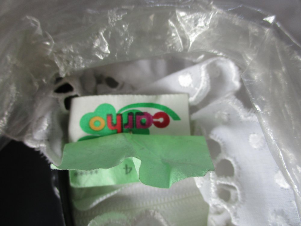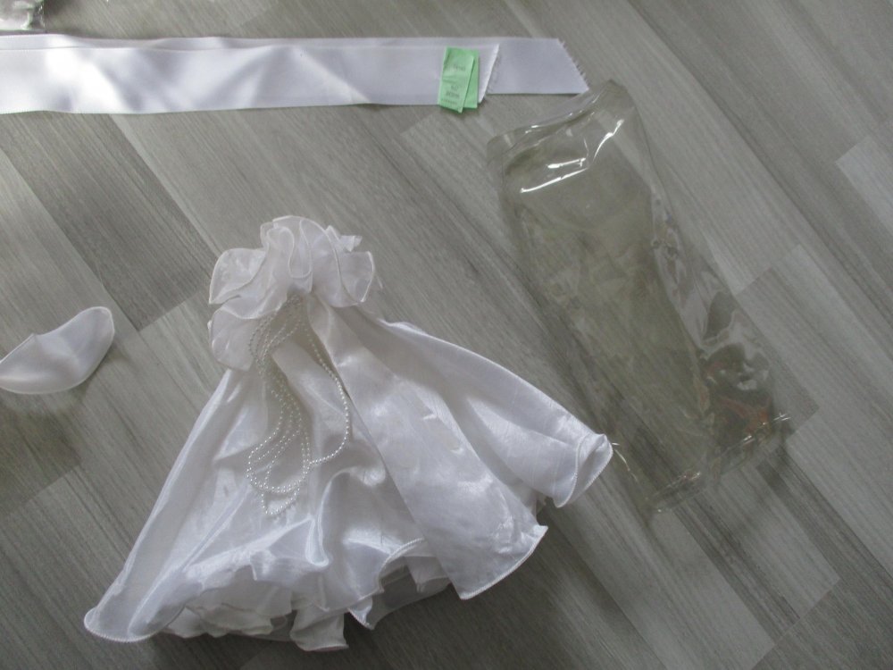 Der Haarschmuck, das Täschchen und das Satinband werden in der runden Kunststoffverpackung aufbewahrt und der Kerzenrock in der runden hohen Verpackung. Bei der runden hohen Verpackung fehlt der Deckel/Boden. Beide Verpackungen weisen mehrere Dellen auf.