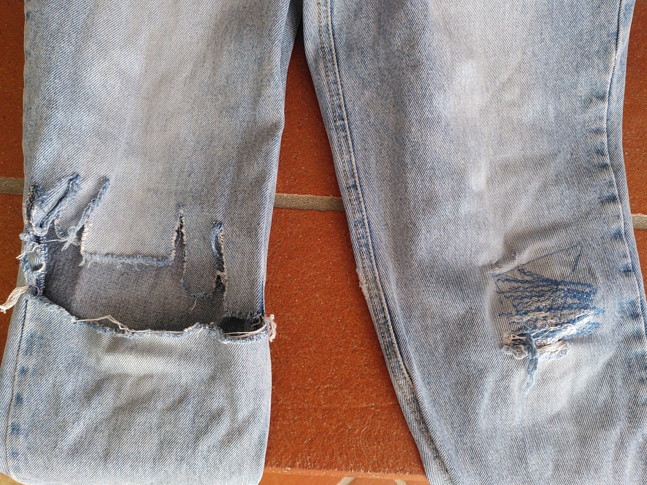 Zustand: Ich hatte die Jeans als Kind zu Fasching an und habe an ihr rumgeschnitten. Man könnte aber gut Shorts/Hotpants daraus machen. Hat ein paar Abwetzungen, außerdem Flecken am Po. Habe es versucht zu fotografieren. Vermutlich high waist. Der Gummibund ist nicht mehr dehnbar.