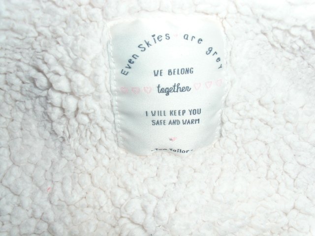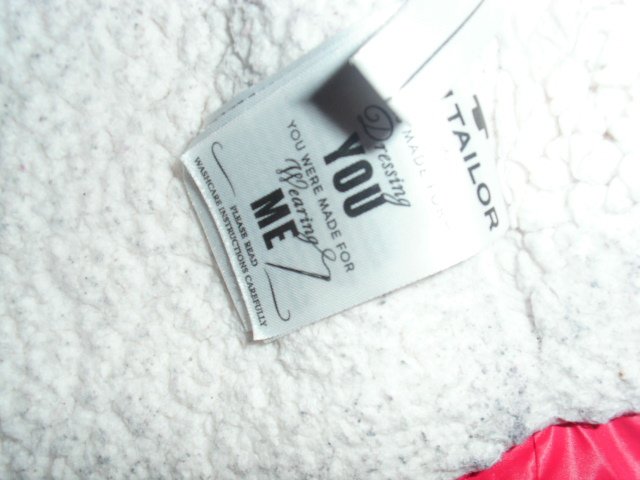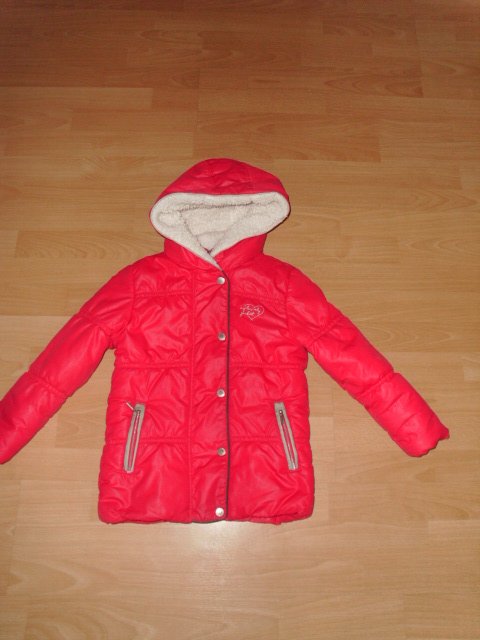 Biete hier eine Winterjacke von Tom Tailor in Größe 116/122 an. Sie ist dunkelpink und hat vorn einen durchgängigen Reißverschluss , welcher unter einer knöpfbaren Blende liegt. Außerdem befinden sich vorn zwei Taschen mit Reißverschlüssen und auf der linken Brustseite ein kleines Motiv. Die Jacke hat eine feste Kapuze. Die Jacke ist warm wattiert und ist innen mit einem hellen Teddyfell versehen, ebenso die Kapuze. Die Ärmel haben innen liegende Strickbündchen. Die Jacke wurde getragen und ist gut erhalten.