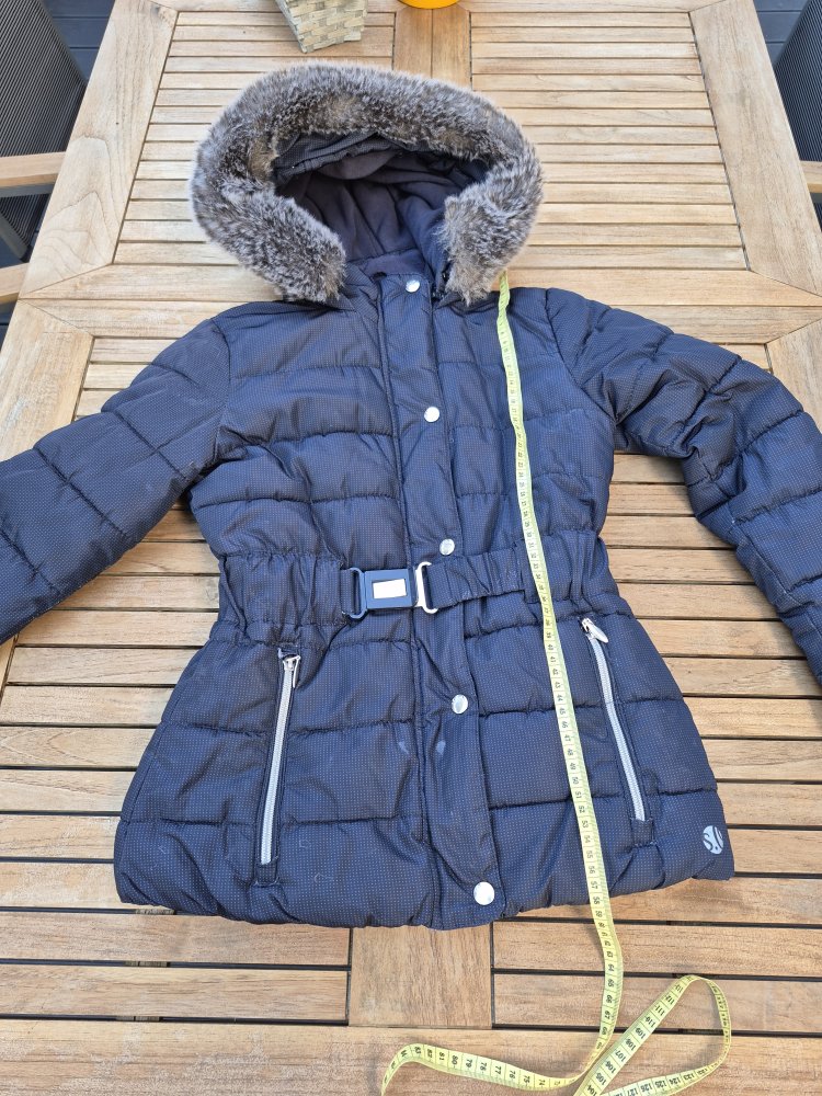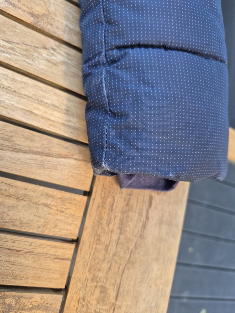 Diesen schicken Wintermantel hat meine Tochter sehr geliebt und zwei Winter viel getragen. Zuerst als "gute" Jacke, im zweiten Winter als Spiel- und Reitjacke. Dies ist vor allem beim Reiten und Schlittenfahren nicht ganz ohne Tragespuren geblieben, s. Fotos. Aber die Jacke ist dennoch wärmend und für Outdooraktivitäten prima tragbar.