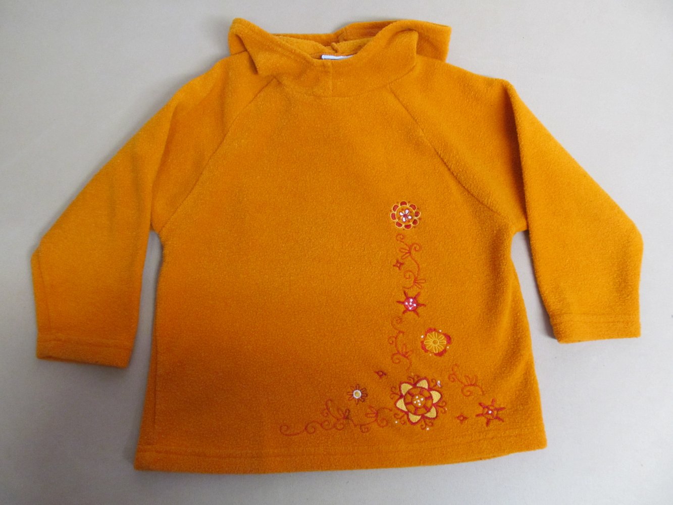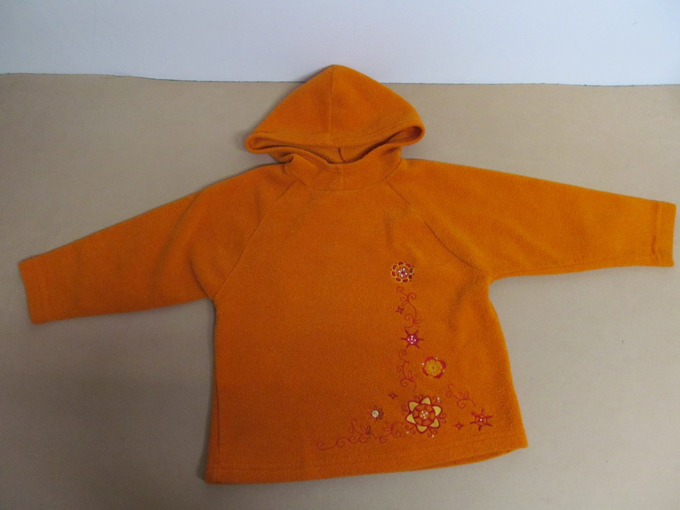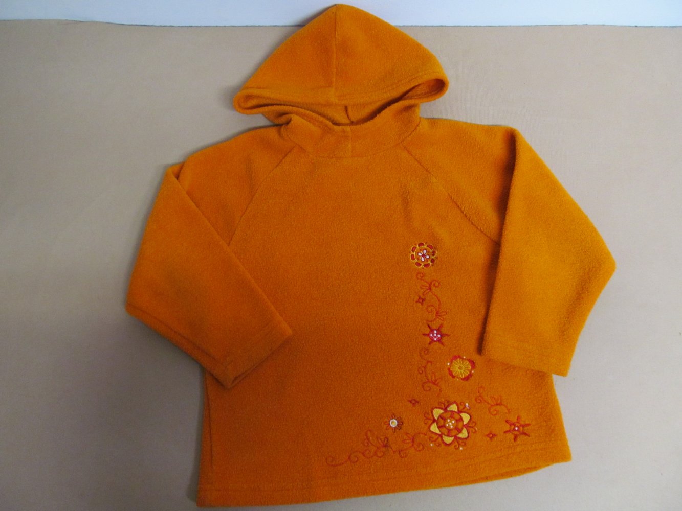 Kapuzenpullover, Hoodie, Frottee/Fleece, orange mit Stickerei, in Gr. 116 von Topolino abzugeben. Getragener Zustand, leichtes Pilling.