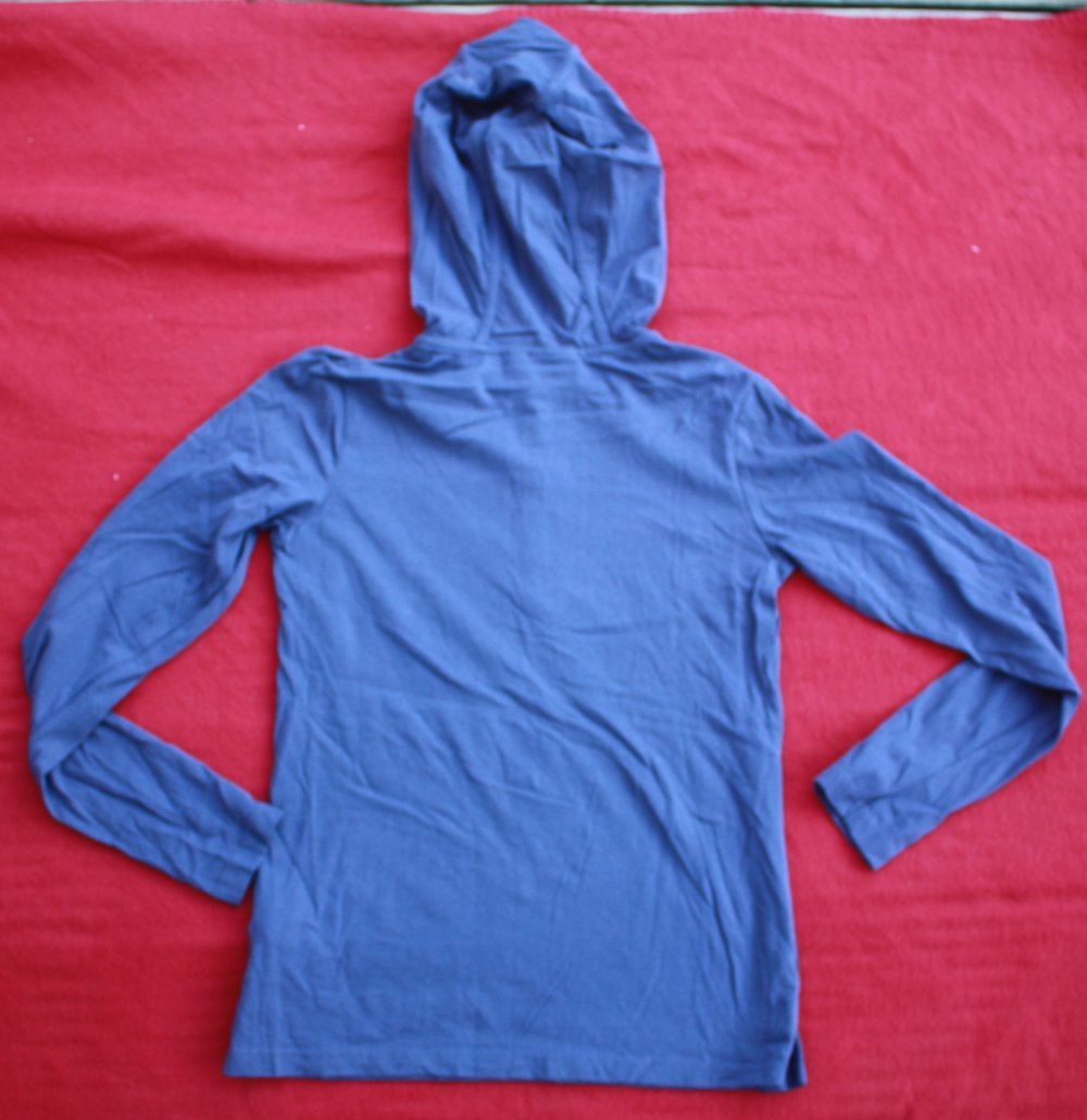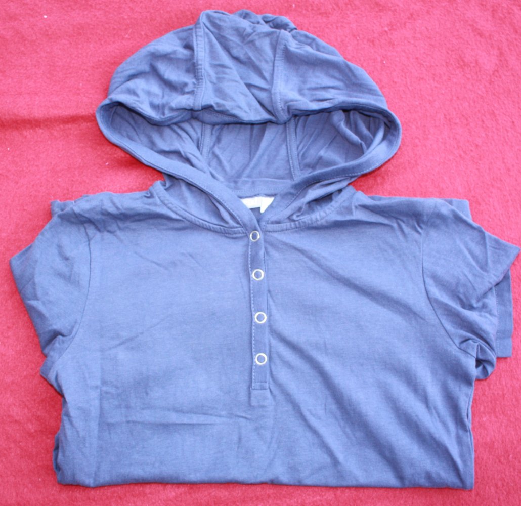 Das Shirt erscheint auf den ersten Blick recht schlicht, ist aber durch die Druckknopfleiste vorne und die edle lila Farbe mit der Kapuze recht sportlich und außergewöhnlich.