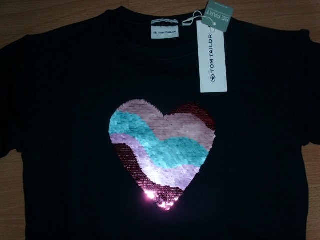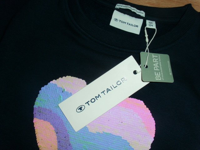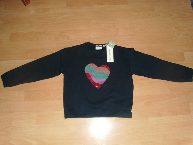 Biete hier ein Sweatshirt von Tom Tailor in Größe 128/134 an. Es ist dunkelblau und besteht aus einem Baumwollgemisch. Vorn befindet sich ein größeres Herz aus Wendepailletten. Das Sweatshirt wurde als Geschenk gekauft, aber das Mädchen war aus dieser Größe schon herausgewachsen. Daher ist es neu, ungetragen und noch mit Etikett versehen.
