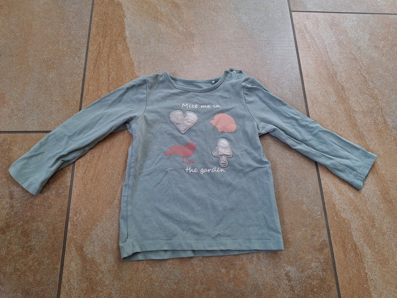 Super niedliches türkises Langarm-Sweatshirt mit herbstlichen Motiven, Gr. 92. Am Halsausschnitt befinden sich zwei Druckknöpfe.