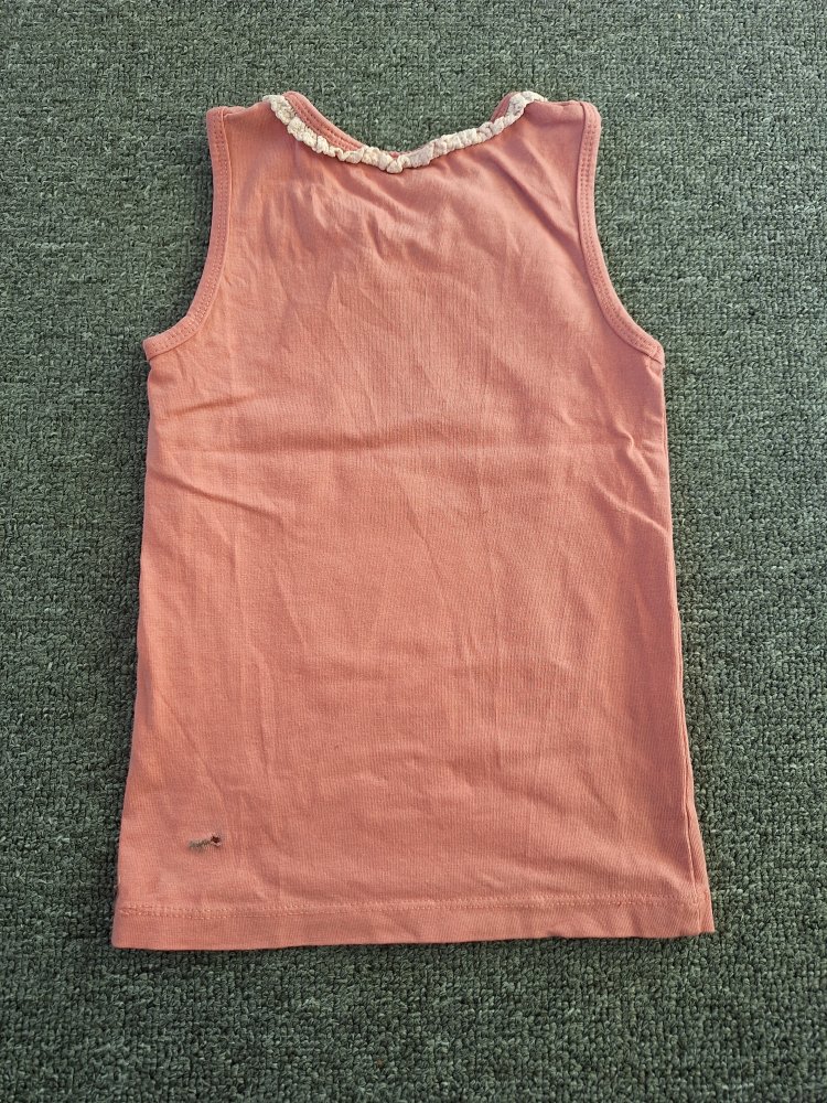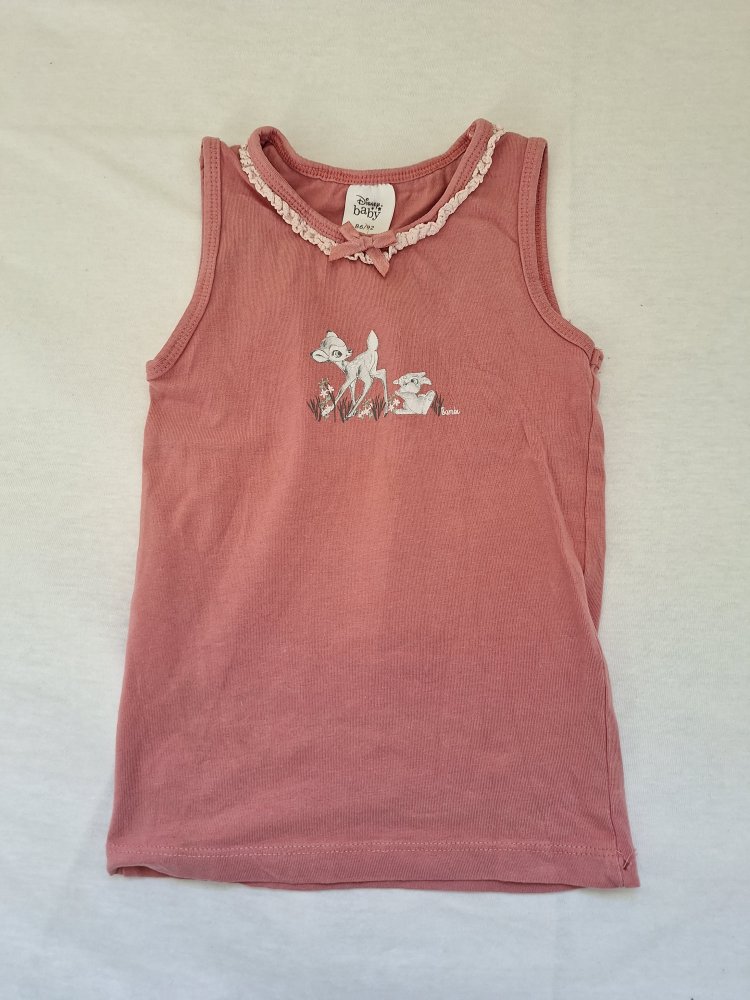 Sehr niedliches Bambi-Unterhemd oder Top mit kleinen Rüschen und Schleifchen am Ausschnitt, Gr. 86/92. Leider vorne ein kleines Löchlein vorhanden, siehe Nahaufnahme, wurde bei uns allerdings eh immer nur "untendrunter" getragen.
