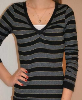 Schwarz grau gestreifter Pullover mit goldenen Streifen und V-Ausschnitt 34 XS