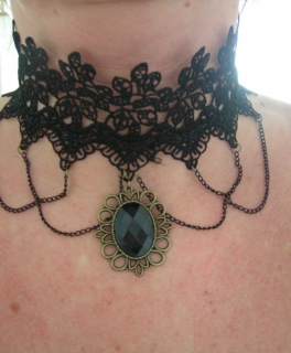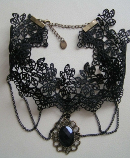Kette Spitze Collier Halsband schwarz mit schwarzen Stein Gothic Burlesque Steampunk Barock Choker
